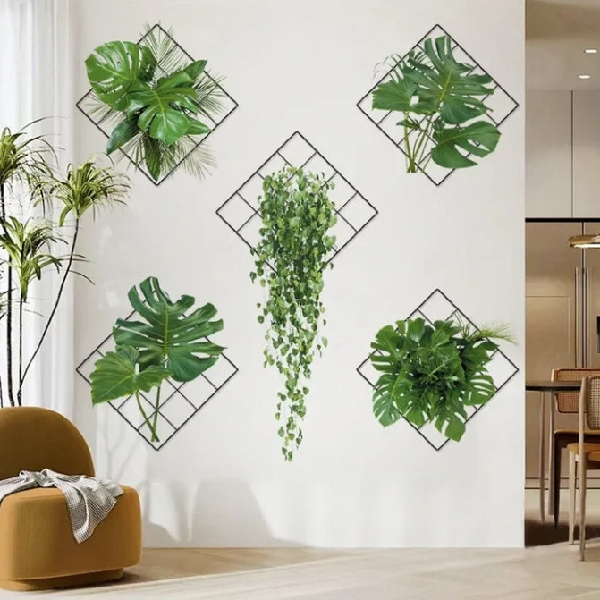 Naklejka ścienna z zieloną rośliną, grafika ścienna ze sztuczną rośliną 3D, rama ścienna z liści do wnętrz, odpowiednia do sypialni, salonu, kuchni, biura.