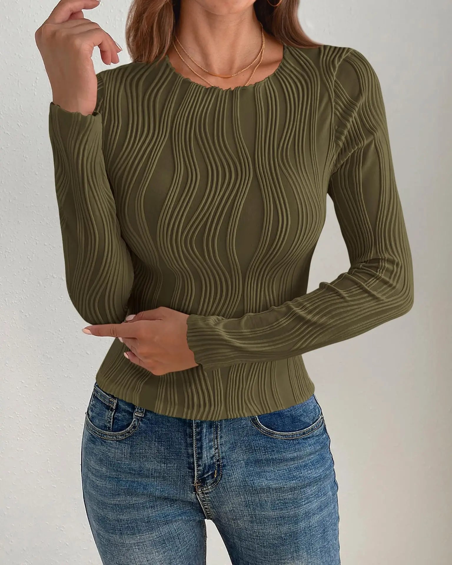 💝Wzór: damski sweter z falowanymi rękawami, okrągłym dekoltem, jednolity kolor, prążkowany, falujący, dopasowany krój, luźne mankiety, elastyczny dół, pokazujący Twój niepowtarzalny urok osobisty, modny i modny.